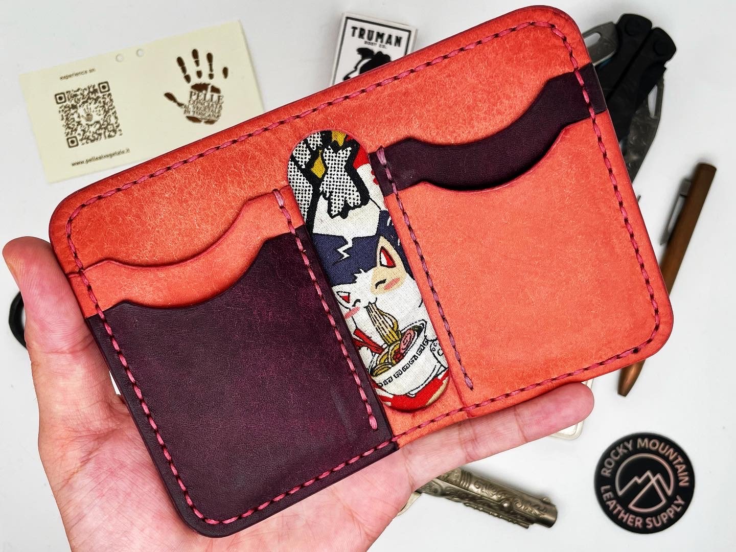I use top-grade premium leathers, mainly from the Badalassi Carlo tannery in Tuscany, Italy. And I use Julius Koch's Tiger Thread from Germany for the strongest saddle stitch. The adhesive is Barge contact cement, and the edges are hand-burnished with Tokonole from Japan. My tools come from Russia and Ukraine, and my customers span the globe. Fun fact: a picture of my BM Mercury wallet is on a hard drive being sent to the moon, thanks to an event by Mr. Beast. My wallets are literally out of this world!